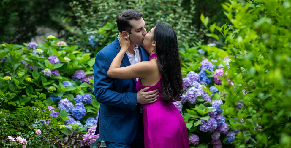 The Chanler on the Cliff Walk is a great spot in Newport, RI for a proposal or an engagement session. They have a lot of beautiful views including the stone steps, the grove of trees, the classic and historic architecture of the hotel itself, the open fields, the classic bicycles, the flagstones, the pillars, the garden, and of course the Cliff Walk overlooking the ocean by First Beach. I always recommend that couples check out Pinterest to find a few engagement poses that they like, and there are a few that I use frequently because they are adorable and flattering. Walking and holding hands, the prom pose, kissing, cuddling, all the favorites! This couple was particularly stylish. They exchanged a gorgeous diamond solitaire engagement ring and a Rolex Cosmograph Daytona watch. An engagement session is always a great way to get lots of great pictures for your save-the-dates, centerpieces, guest book, and gift table. Plus, you get to have a great time and get a bunch of great portraits with your fiancée!